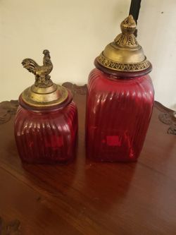 Red Ribbed Glass Canister with Rooster Lid