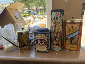 Set of 4 vintage decorative tins including Camp Coffee, Queensberry's, and Pasta.$10Los Angeles, CA