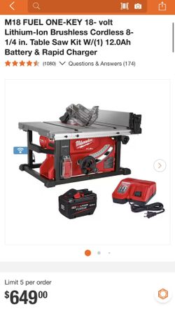 M18 FUEL ONE-KEY 18- volt Lithium-Ion Brushless Cordless 8-1/4 in. Table Saw Kit W/(1) 12.0Ah Battery & Rapid Charger$500Coachella, CA