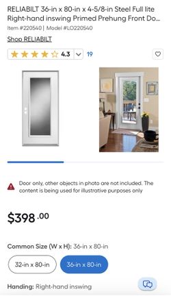 ReliaBilt 36-in x 80-in Steel Full Lite Right-Hand Inswing White Primed Prehung Single Front Door$350Fresno, CA