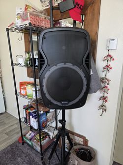 PA speaker mounted on a tripod stand, designed for portable audio reinforcement.