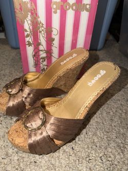 VINTAGE 1990’S NEW IN BOX GROOVE BRAND LADIES SZ 9 5” CORK WEDGES W TAN SATIN$10Jamison, PA