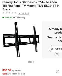 Stanley Tools DIY Basics 37-In. to 70-In. Tilt Flat Panel TV Mount, TLR-ES2215T in Black Big sale! Moving sale! In very good condition. Pick up in $15Carson, CA