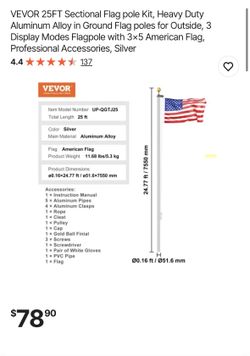 VEVOR 25FT Sectional Flag pole Kit, Heavy Duty Aluminum Alloy in Ground Flag poles for Outside, 3 Display Modes Flagpole with 3x5 American Flag$50North Las Vegas, NV