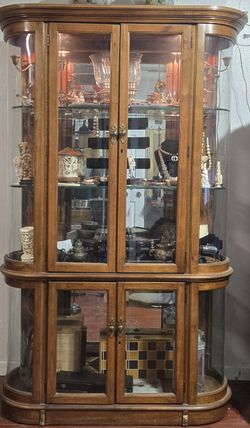 Cabinet 4 door oak curio with beveled glass and lighting by Pulaski Furniture ( Very Good Condition )$195Westminster, CA