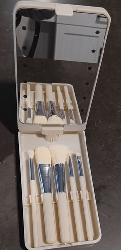 Compact with mirror and assorted make up brushes, lid can rotate, lights up by round battery button. Used but not any of the brushes$5Fontana, CA
