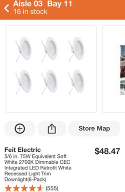 Feit Electric 5/6 in. 75W Equivalent Soft White 2700K Dimmable CEC Integrated LED Retrofit White Recessed Light Trim Downlight(6-Pack)$30Phoenix, AZ