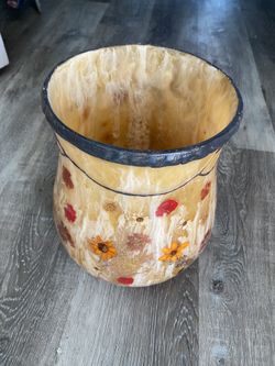 VINTAGE MCM LUCITE ACRYLIC HONEY SWIRL REAL PRESSED FLOWERS WASTE BASKET 10.5"$150Houston, TX