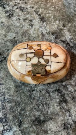 Vintage Brass Inlayed Camel Bone Oval Trinket Box with Brass Owl Closure Clasp$10Montclair, CA