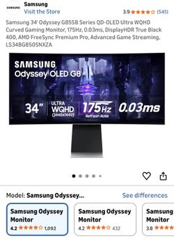 Samsung 34' Odyssey G85SB Series QD-OLED Ultra WQHD Curved Gaming Monitor 175Hz$575Dallas, TX