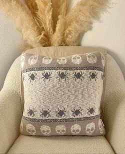 BRAND NEW W/TAG + RARE Mary & Edgar Halloween Beige And White Knitted Skulls + Spiders Decorative Pillow $43Monterey Park, CA