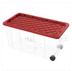 HDX 77 Gal. Tough Storage Tote with Wheels in Clear with Red Lid$45Orlando, FL