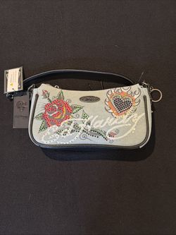 Ed Hardy Denim Baguette Shoulder Bag Blue Rhinestone Rose & Heart Tattoo NWT$45Fresno, CA