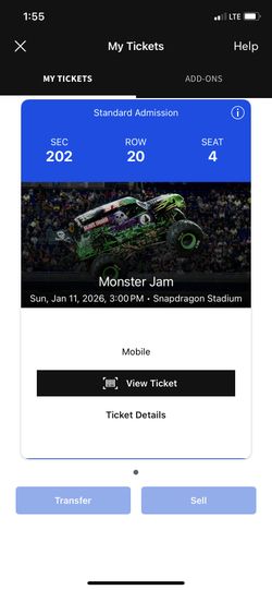 1 Monster Jam Ticket Section 202 Sunday 1/11$35Chula Vista, CA