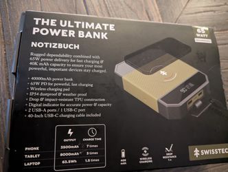 Swiss Tech 40000 mAh Wireless Power Bank, Charging Pad, 65W Fast Charge, IP54 Weatherproof$52Kent, WA