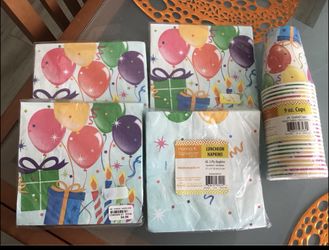 NEW~Happy Birthday Party Supplies Set~4 packages of 40 2-ply Napkins~1 package 24~9oz coated Cups$5Cape Coral, FL