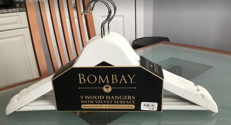 NEW~Bombay 5 Wood Hangers~Velvet Surface Strong~durable hangers with wood bar to hang pants~new in Package$4Cape Coral, FL