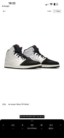 *Rare Size 9.5 - Air Jordan 1 Retro '99 White$200Montebello, CA