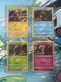 Pokémon detective pikachu promo set holos detective pikachu, psyduck, bulbasaur, and snubull$49Fallbrook, CA