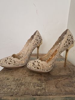 BCBG PEACOCK CREAM SUEDE IRRIDESCENT CRYSTAL CUT-OUT STILETTO HEEL$60West Hollywood, CA
