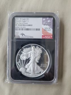 2021 W Silver Eagle Heraldic Eagle T-1 PF70 Ultra Cameo Signed the 12 Chief engraver John M Mercanti authentic hand sign