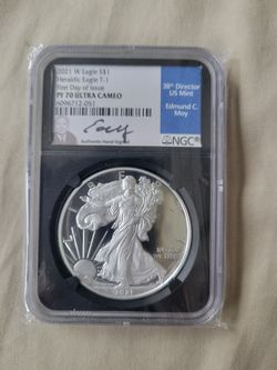 2021 W Silver Eagle Heraldic Eagle T-1 First Day Of Issue Silver Dollar PF 70 Signed By The 38 Director US Mint Edmond C Moy$270Fresno, CA