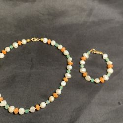 Small children’s size, necklace, and bracelet, pearl and aquamarine and agate stone with gold clasp and ornament$80Berenda, CA
