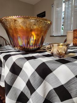 Amber Carnival Glass Punch Bowl, Ladle And 16 Cups$30San Antonio, TX