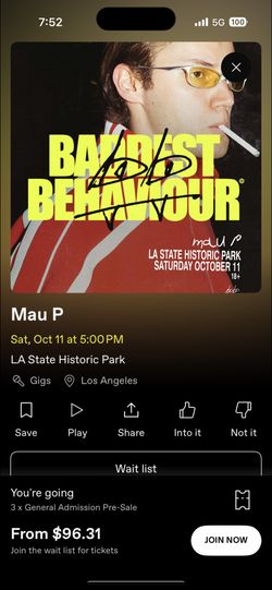 Mau P - La Historic Park Sat 10/11 $90San Dimas, CA