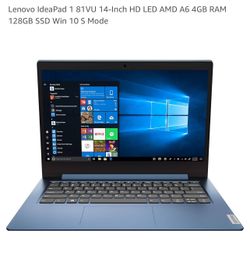 Lenovo IdeaPad 1 81VU 14-Inch HD LED AMD A6 4GB RAM 128GB SSD Win 10 S Mode$120Carrollton, TX