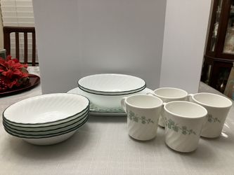 Lot of 11 Pieces Corning Ware Corelle Callaway Green Ivy Leaves Swirl 2 Oval Serving Platter 5 Soup Cereal Bowl 4 Coffee Mugs No Veggie Bowls EUC$40Las Vegas, NV
