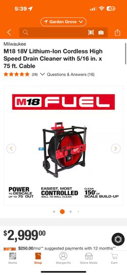 Milwaukee M18 18V Lithium-lon Cordless High Speed Drain Cleaner with 5/16 in. x 75 ft. Cable$2,400Garden Grove, CA