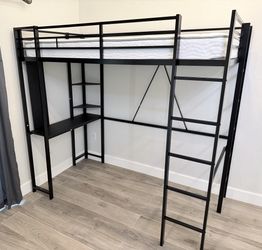 Like New Black Twin Size Metal Loft Bed with Built-in Desk and 2-Shelves, 2-Ladders$250Newport Beach, CA