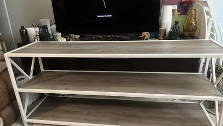Long bookshelf manufactured grey wood and white metal$30San Diego, CA