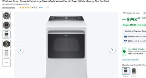 Whirlpool Smart Capable Extra Large Steam Cycle Electric Dryer$400Gardena, CA