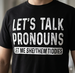 The Mainstream Choice: "Let's Talk Pronouns" Graphic Tee – She/Them Pun T-Shirt$10Oakland, CA