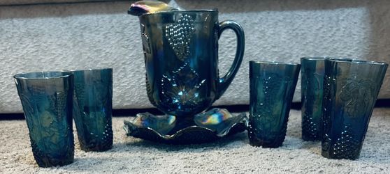 Indiana Harvest Grape Blue Carnival Glass Pitcher w Tumbler Set$90Henderson, KY