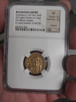Gold coin Byzantine empire constant 11, ad 641-668 av light solidus 23-siliqua weight rv cross poten$750San Jose, CA