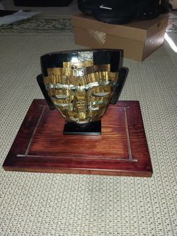 Stone mask on wood stand in glass case made in mexico$150San Jose, CA