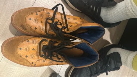MCM Visetos High-Top Sneakers in the brand's signature cognac (honey) color. $450Brentwood, CA