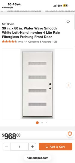 Sold36 in. x 80 in. Water Wave Smooth White Left-Hand Inswing 4 Lite Rain Fiberglass Prehung Front Door$349North Las Vegas, NV