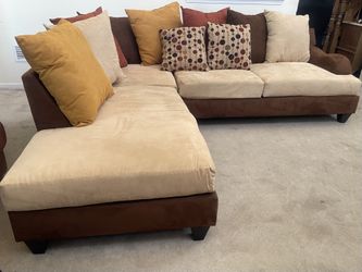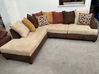 2pc Brown, Beige & Mustard Upholstered Pillow Back Sectional Chaise Sofa$350Romeoville, IL
