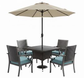 5-Piece Metal Patio Outdoor Dining Set with Rattan Woven Backrest,4 Chairs, Large Table, Umbrella Hole and Blue Cushions$200El Monte, CA