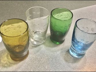 Vtg. 1950s Set Of 4 Shot / Cordial Glasses 2.5” Tall Etched Wheat Pattern Colorful Barware $5Garden City P, NY