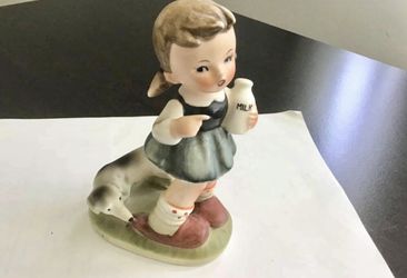 Vtg.1950s Hummel Style Figurine Girl w/ Milk Bottle + Dog Erich Stauffer $5Garden City P, NY