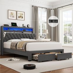 HIFIT Full Size LED Bed Frame with Storage Headboard and Charging Station, Linen Upholstered Bed Frame Full Size with 2 Drawers, Camas Full with Butto$130Ontario, CA