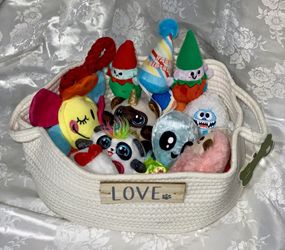 Pet toy storage filled W/ various dog toys, storage bin is a white, woven cotton rope basket$35Kapolei, HI