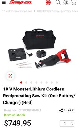 Snap-on Snap On MonsterLithium Cordless Reciprocating Saw Kit (One Battery/ Charger) (Red)$200Rancho Cucamonga, CA