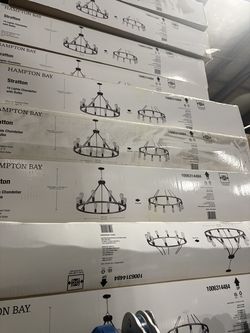 Hampton Bay Stratton 10-Light Black and Woodgrain Wagon Wheel, Industrial Farmhouse Dining Room Chandelier with Bulbs Included Store SKU# 1006-314-484$180Marietta, GA