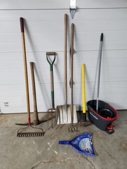 Bunble Of Yard Tools (Pick, Rake, Sledge Hammer, Large Shovel, Spading Fork, Gardening Fork, Long Handle Cultivator), Mop & Dust Pan$39New City, NY